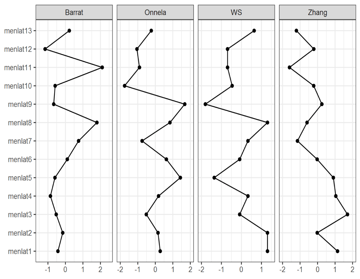 Figure 3: Clustering. Source: Elaborated with data study. The Barrat, Onnela, WS & Zang coefficients measure the relationship between the central node with respect to the peripheral edges