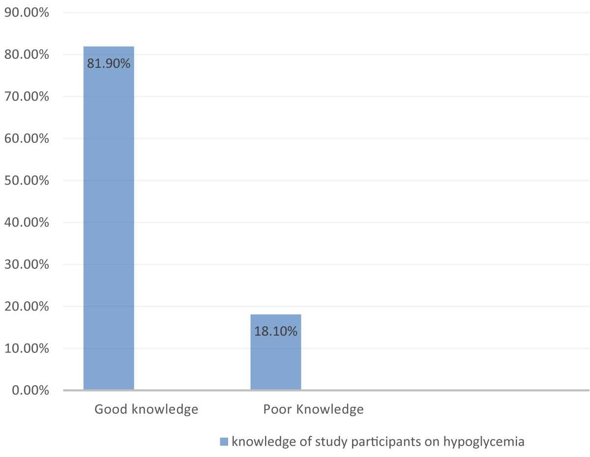Still, the knowledge level of diabetic patients concerning hypoglycemia was 66.1% followed by 80% of the patients knowing that they must consume some sweets or chocolates and these findings revealed that almost the findings of the current study are higher in African countries including Ethiopia and India [8].