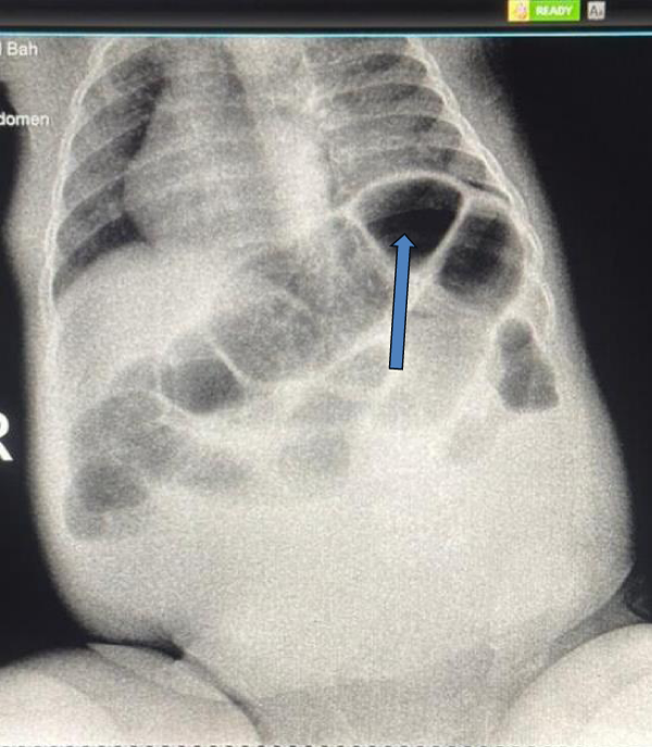 On examination, the infant was found to be pale, moderately dehydrated, and afebrile (36.7 °C). The patient exhibited subcostal and intercostal retractions, along with rhonchi on auscultation, indicative of respiratory distress. On abdominal examination, abdominal distention and tenderness were present, and a palpable mass in the right upper quadrant suggested a possible obstructive etiology.
