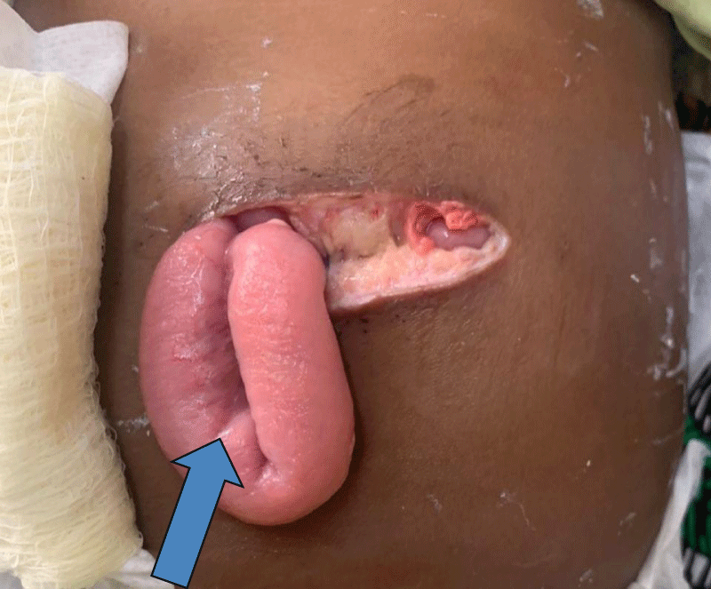 Figure 2: Protruding small bowel from the surgical wound due to full-thickness wound dehiscence (arrow).