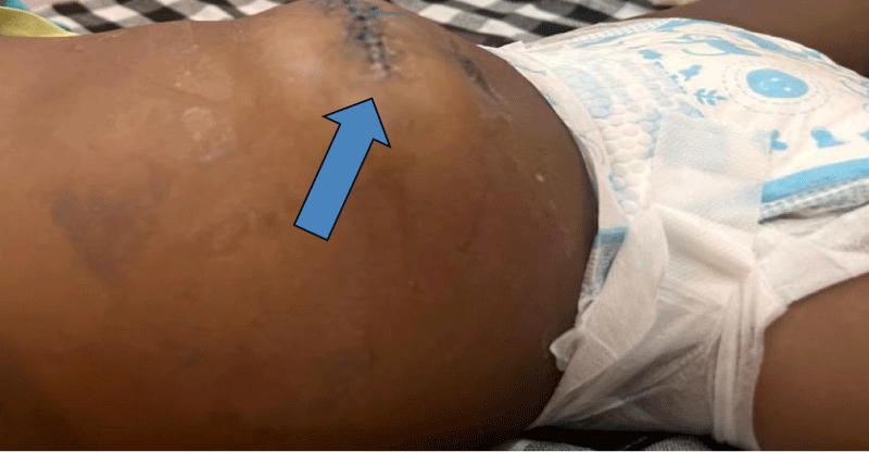 Postoperatively, the child’s recovery was complicated by delayed wound healing and subsequent wound dehiscence (Figure 2). On the ninth day after surgery, the surgical wound showed signs of poor healing, and a small portion of the incision broke down completely leading to a small bowel protruding from the surgical site. Although infection was considered, no overt signs of purulent drainage or systemic infection were noted. The dehiscent wound was closed in layers, with non-absorbable skin sutures, by a surgical resident, and daily dressing changes, along with close monitoring for infection were initiated. The patient was continued on intravenous antibiotics as a precaution and nutritional support was adjusted with enteral feeds as tolerated. Despite the resolution of respiratory symptoms, the child’s bowel was again noted to be protruding from the surgical wound by the fifteenth day, and the dehiscent wound was closed again. This time absorbable sutures were used for the thin and retracted muscle layer, and non-absorbable mass closure sutures were used for the muscle/fat/skin.