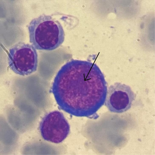 Figure 1: Bone marrow aspirate (MGG stain; x100) showing a proerythroblast with intranuclear inclusion.